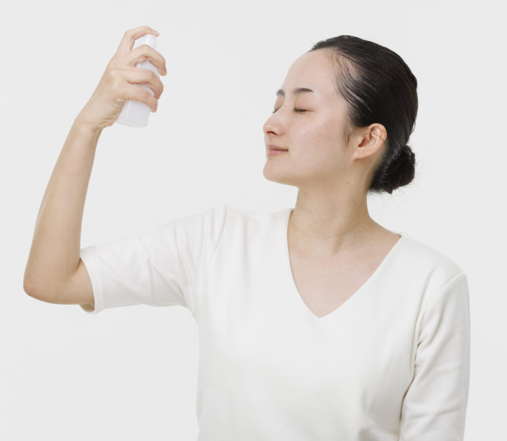 適量を肌全体に吹きかけ、手のひら全体で肌をあたためるように覆い、なじませます。